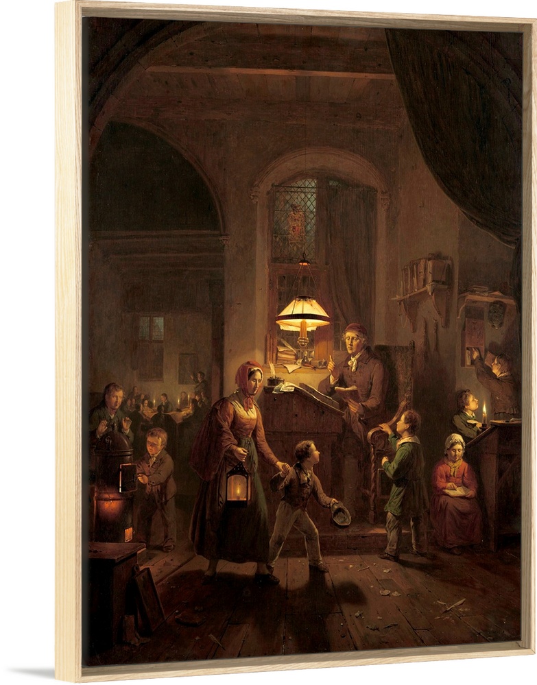 <p>Night School, by George Gillis Haanen, 1835, Dutch painting, oil on panel. A mother with a lantern brings her son to school where other boys and one girl read by candlelight. The school master is at his desk. At left two boys warm up by a stove, and in the background is class of older students.</p>