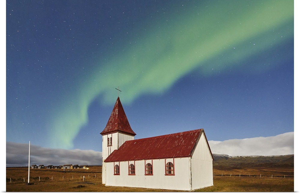 <p>Night sky and Northern Lights (Aurora Borealis) over the church in the village of Hellnar, in Snaefellsjokull National Park, Snaefellsnes peninsula, west coast of Iceland, Polar Regions</p>