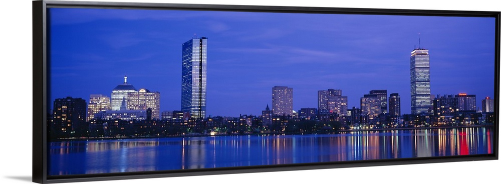 <p>Panoramic night skyline with building lights reflecting onto the waterfront.</p>