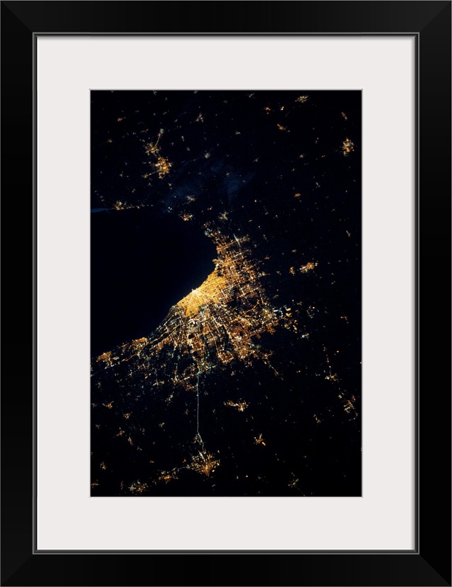 <p>Night time satellite image of Chicago and Lake Michigan, Michigan, USA</p>