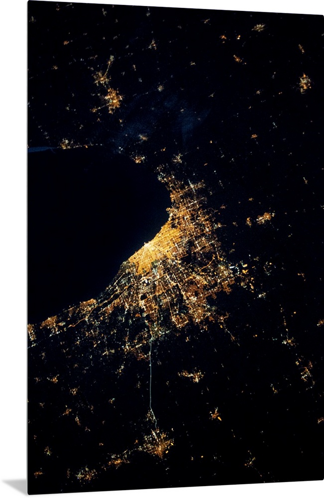 <p>Night time satellite image of Chicago and Lake Michigan, Michigan, USA</p>