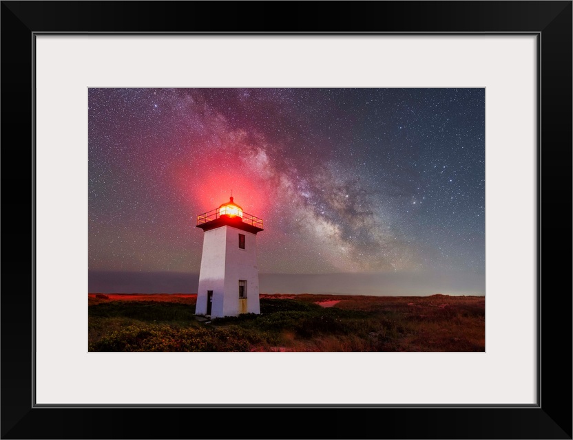 <p>Landscape photograph of a white lighthouse underneath the milky way with a shining red light at the top.</p>