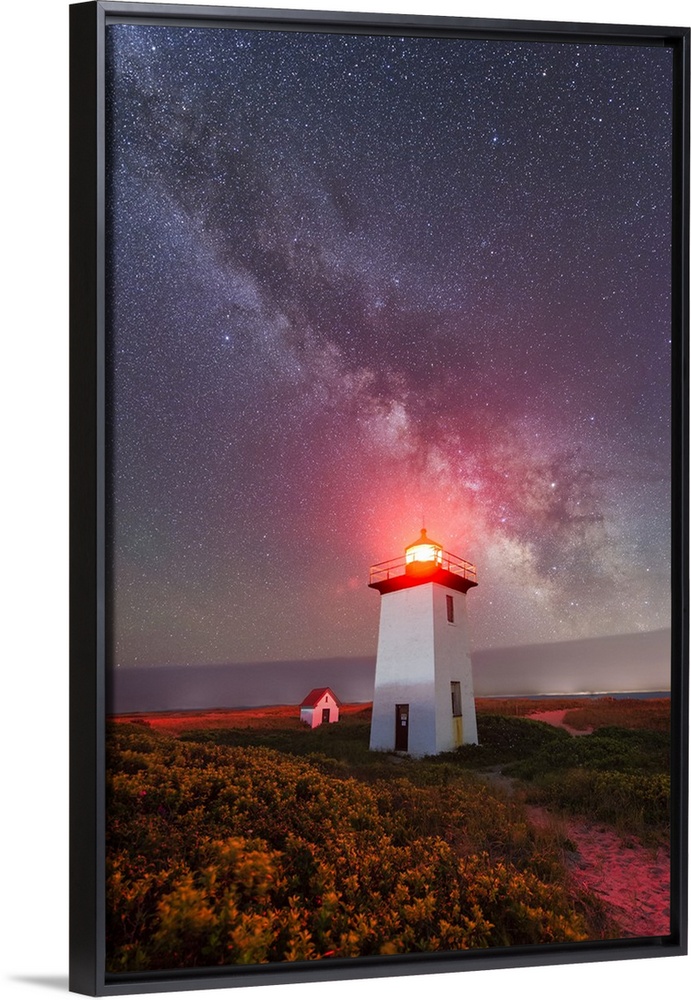 <p>Photograph of a white lighthouse with a red light shining on top with the Milky Way in the sky above.</p>