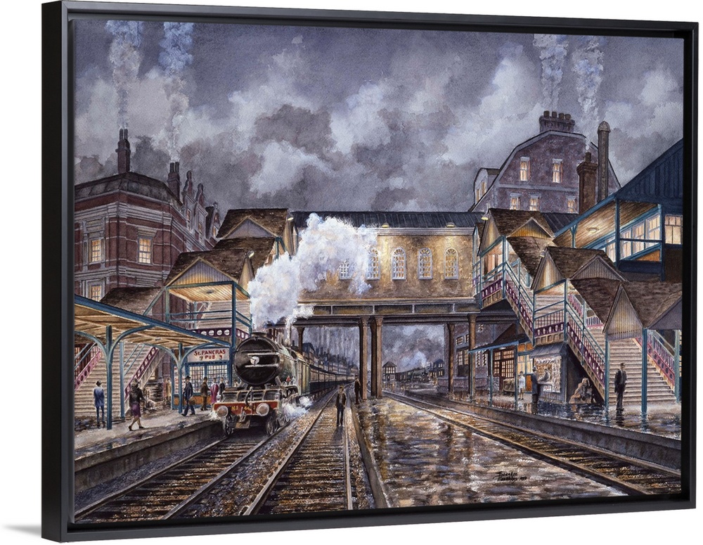 <p>Contemporary painting of a train making a stop to pick up passengers at dusk.</p>
