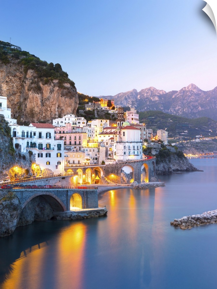 <p>Night view of Amalfi cityscape on coast line of Mediterranean sea, Italy.</p>