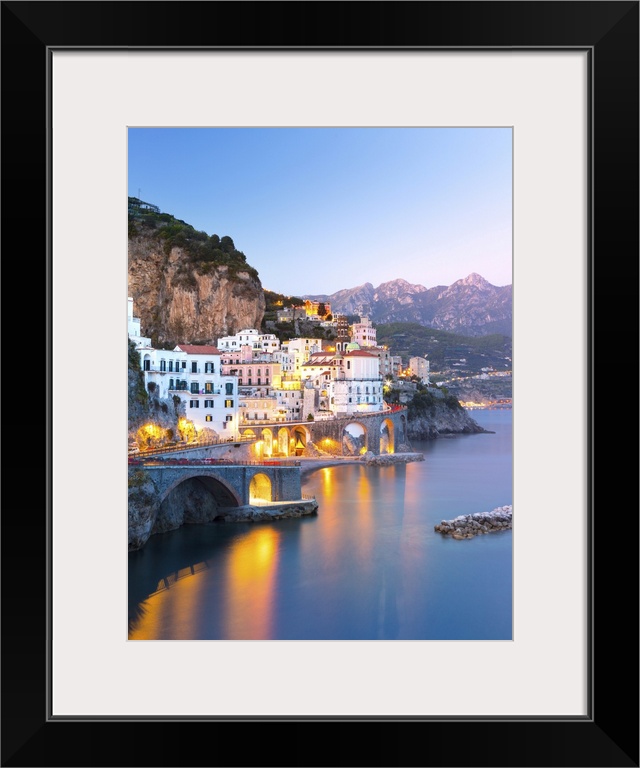 <p>Night view of Amalfi cityscape on coast line of Mediterranean sea, Italy.</p>