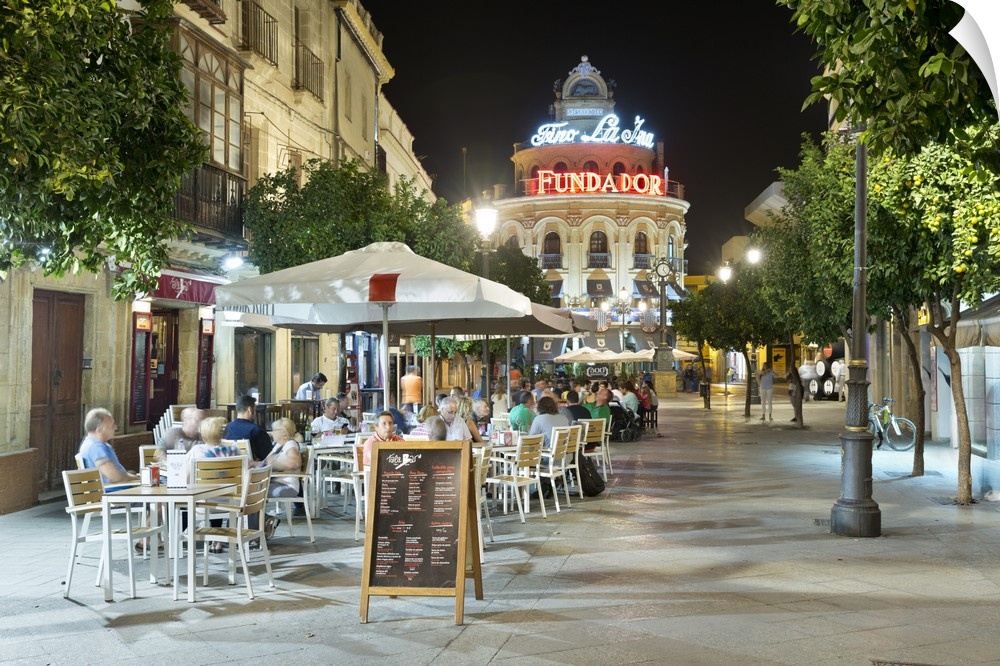 <p>Night view of cafes along Calle Lanceria and El Gallo Azul rotunda building, Jerez de la Frontera, Andalucia, Spain</p>