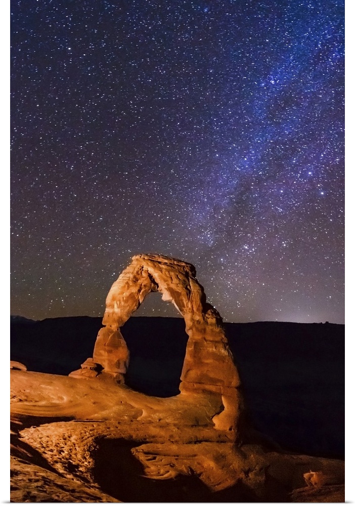 <p>Night view of delicate arch and stars and Milky Way in southern sky, Arches National Park, Moab, Utah, United States.</p>