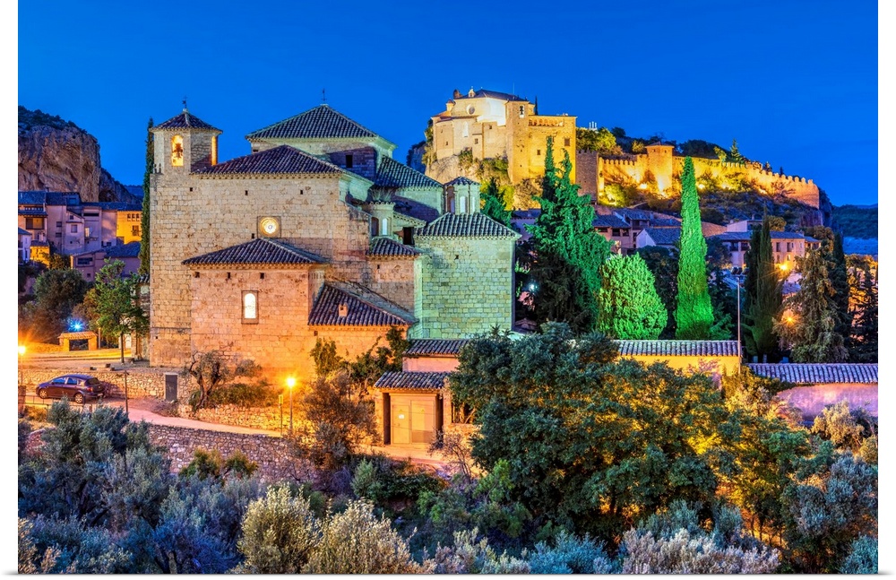 <p>Night view of Iglesia de San Miguel Arcangel church with the castel and Collegiate church of Santa Maria in the background, Alquezar, Aragon, Spain.</p>