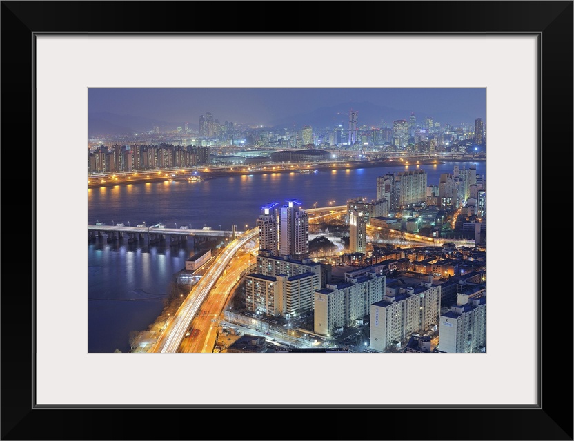 <p>Big canvas photo of a city in Korea lit up at night along the water.</p>