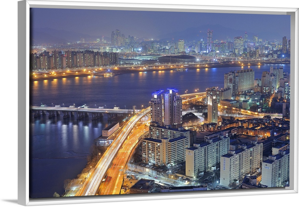 <p>Big canvas photo of a city in Korea lit up at night along the water.</p>
