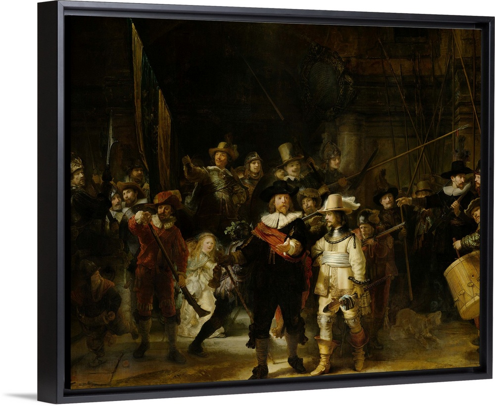 <p>Night Watch, by Rembrandt van Rijn, 1642, Dutch painting, oil on canvas. The painting, originally titled 'Militia Company of District II under the Command of Captain Frans Banninck Cocq and Lieutenant Willem van Ruytenburch,' was painted for one of the halls of Amsterdam's civic guard, the city's militia and police.</p>