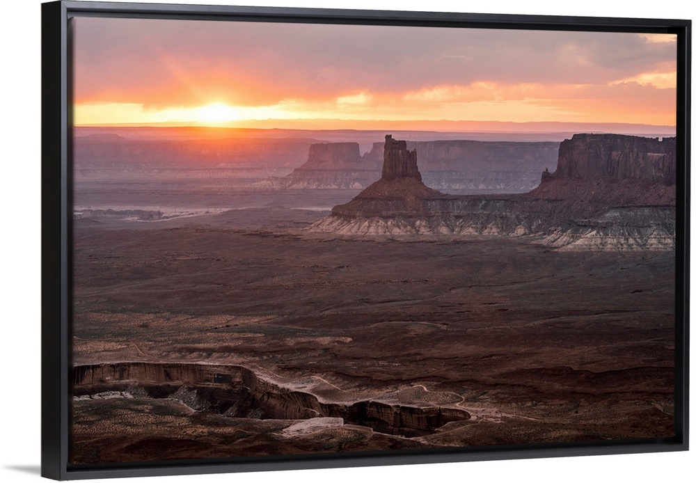 <p>The sun setting on the horizon behind sandstone rock formations, over White Rim Trail, Canyonlands National Park, Moab, Utah.</p>