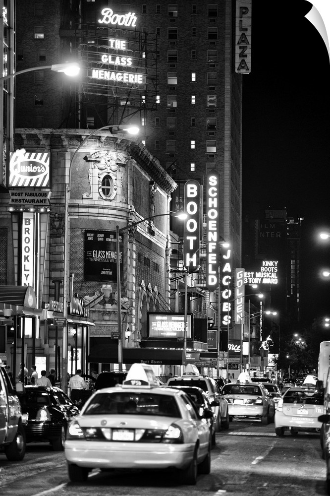 <p>Taxis driving down Broadway in New York City in the evening.</p>