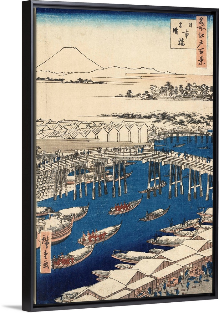 <p>Ando, Hiroshige, 1797-1858. Nihonbashi yukibare. Date Created/Published: 1856. Color woodblock print; 33.9 x 22 cm. Print shows several boats on the river approaching the Nihonbashi, with Mount Fuji in the distance. From the series: Meisho edo hyakkei : 100 famous views of Edo.</p>