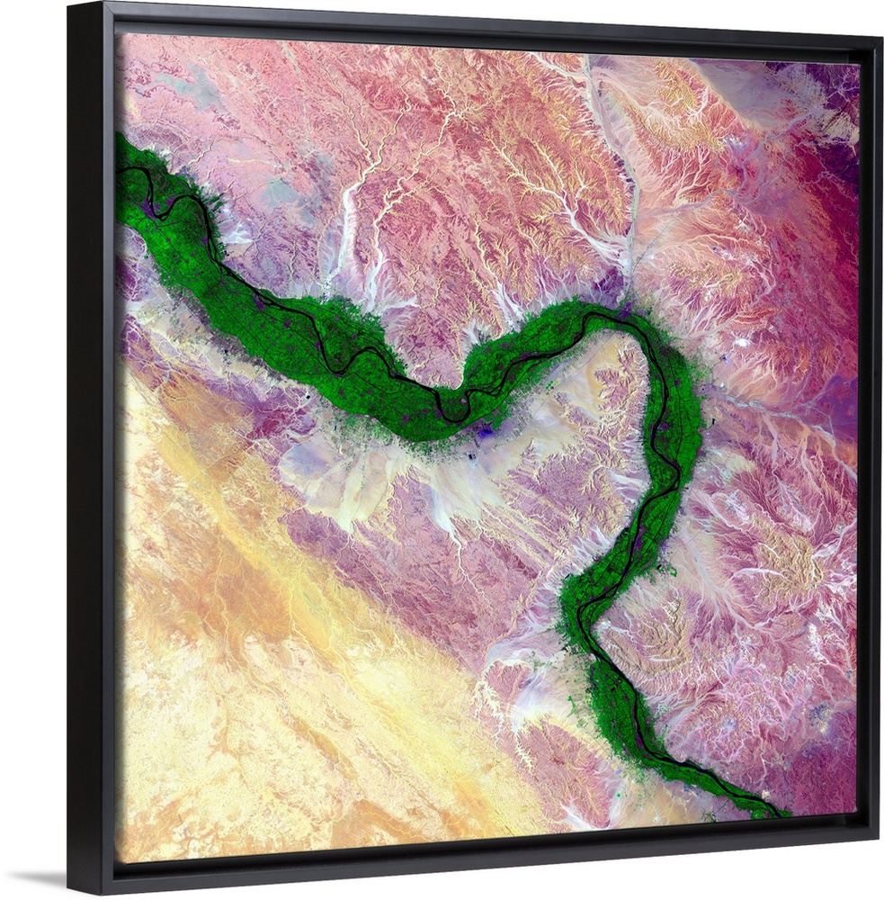 <p>Nile and Egyptian desert, satellite image. Along the Nile River in Egypt, farmland (green) is maintained on the river's floodplain in stark contrast to the surrounding arid desert. The ability to farm along this river has sustained civilisations in this area for thousands of years. This region of the river includes the city of Luxor and many of the famed structures and buildings of Ancient Egypt. Image data obtained by the Landsat 8 satellite on 15 August 2014.</p>