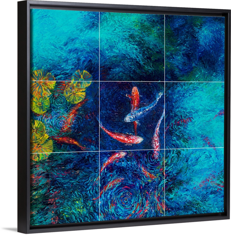 <p>Brightly colored contemporary artwork of nine red fish and one blue fish swimming in a pond.</p>