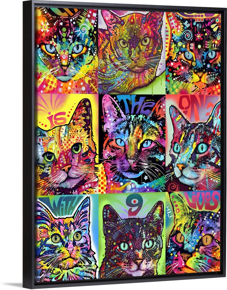 <p>Graffiti style art that has "The Best Cat is The One With 9 Lives" painted in individual boxes with a different cat in each box.</p>