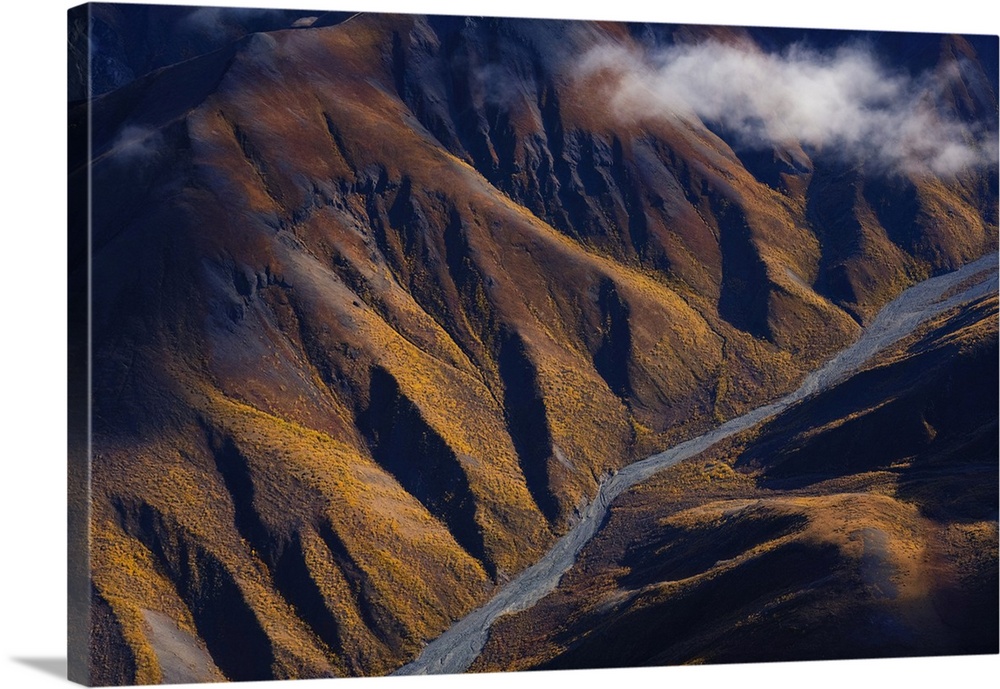 <p>Late afternoon sun lights up the autumn colors on the slopes as nines creek flows through the mountains on its way to the arctic ocean, destruction bay, Yukon, Canada.</p>