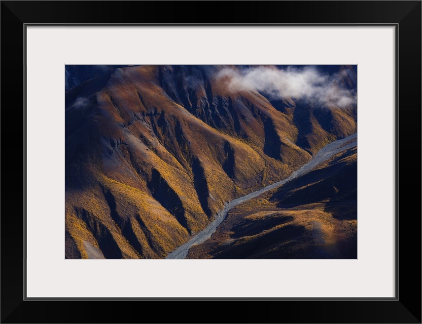 <p>Late afternoon sun lights up the autumn colors on the slopes as nines creek flows through the mountains on its way to the arctic ocean, destruction bay, Yukon, Canada.</p>