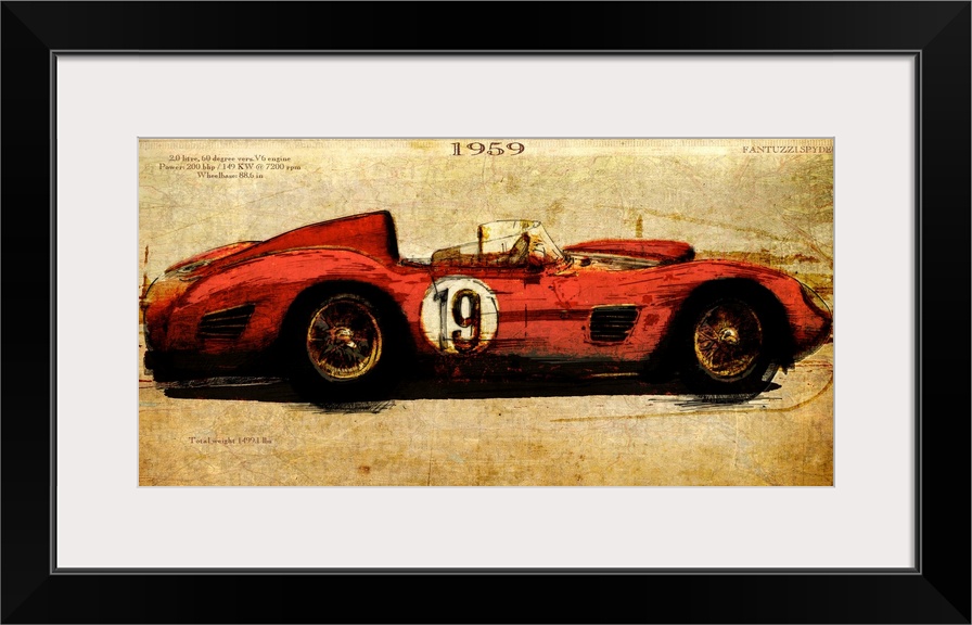 <p>Contemporary artwork of a vintage race car in profile. On a weathered and rustic background.</p>