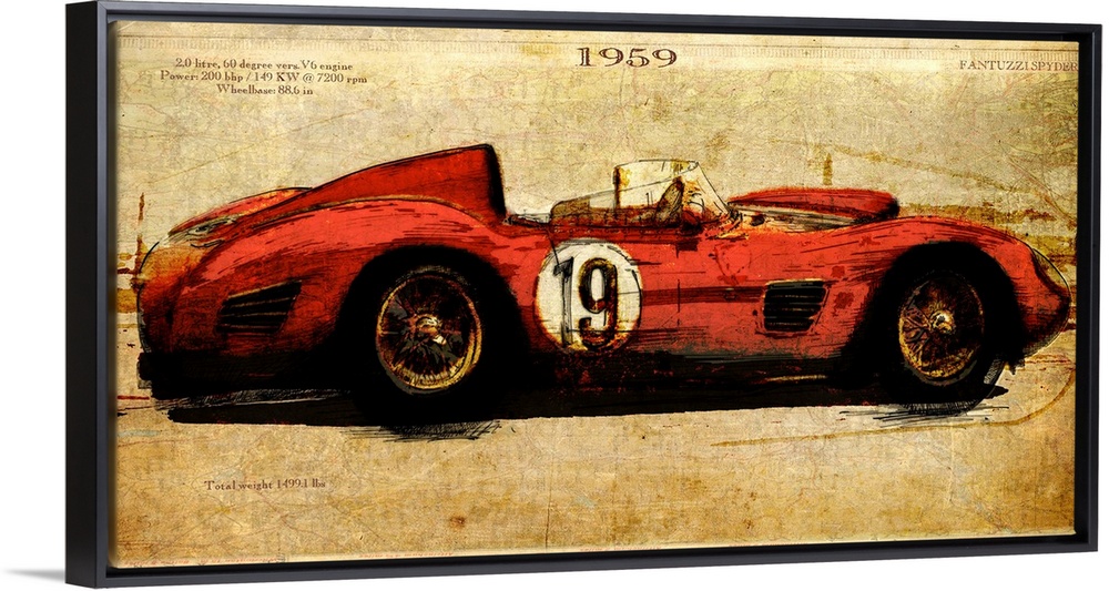 <p>Contemporary artwork of a vintage race car in profile. On a weathered and rustic background.</p>