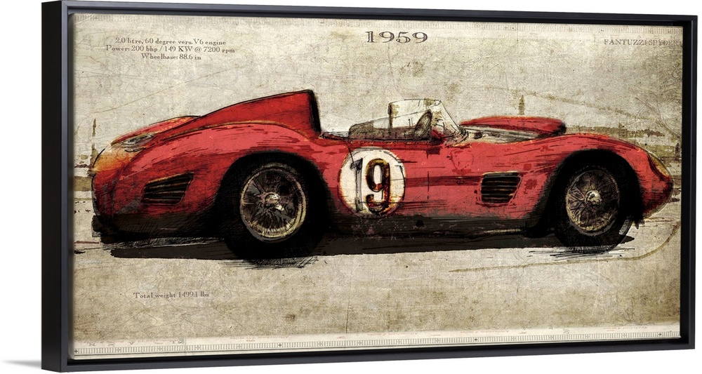 <p>Contemporary artwork of a vintage race car in profile. On a weathered and rustic background.</p>