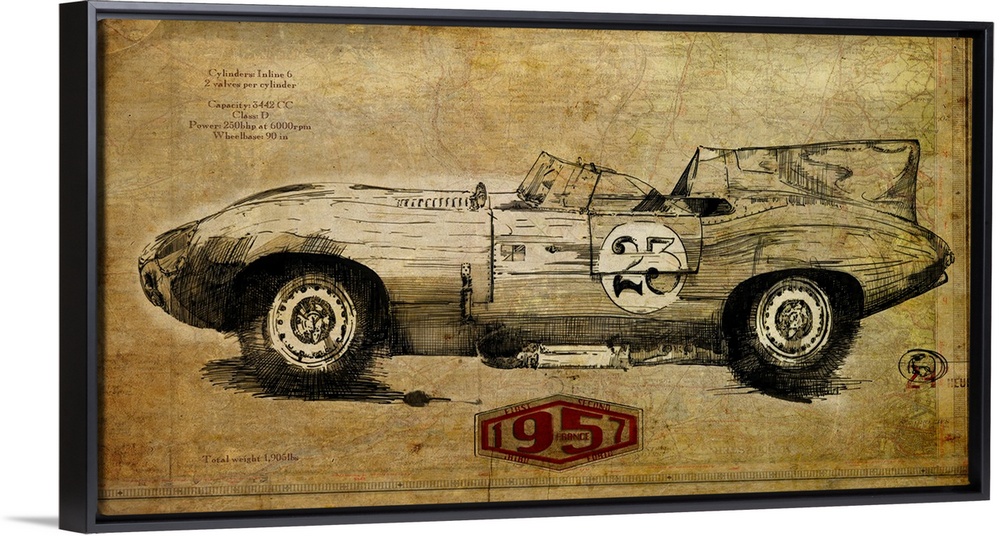 <p>Contemporary artwork of a vintage race car in profile. On a weathered and rustic background.</p>
