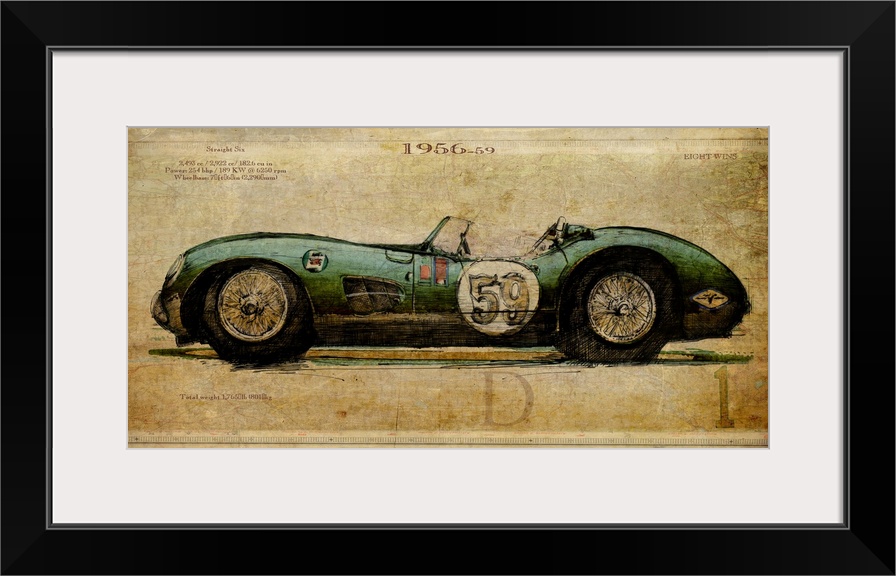 <p>Contemporary artwork of a vintage race car in profile. On a weathered and rustic background.</p>