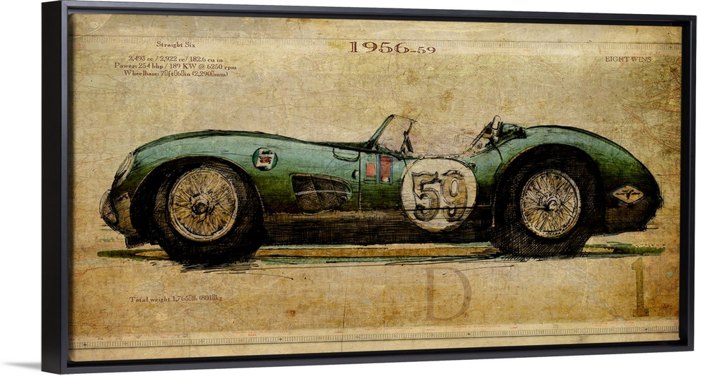 <p>Contemporary artwork of a vintage race car in profile. On a weathered and rustic background.</p>