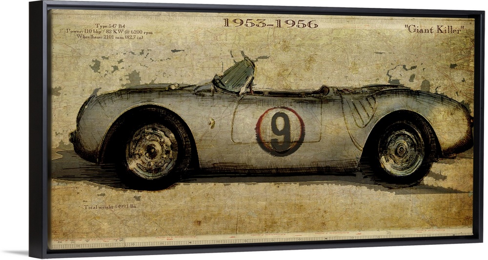 <p>Contemporary artwork of a vintage race car in profile. On a weathered and rustic background.</p>