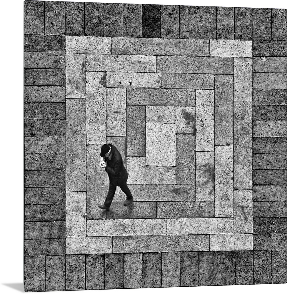 <p>A man walking on a stone street which creates a square when viewed form above.</p>