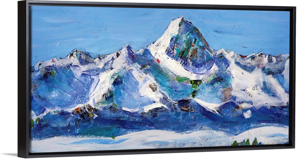 <p>Abstract painting of a snowy mountain landscape in cool tones.</p>