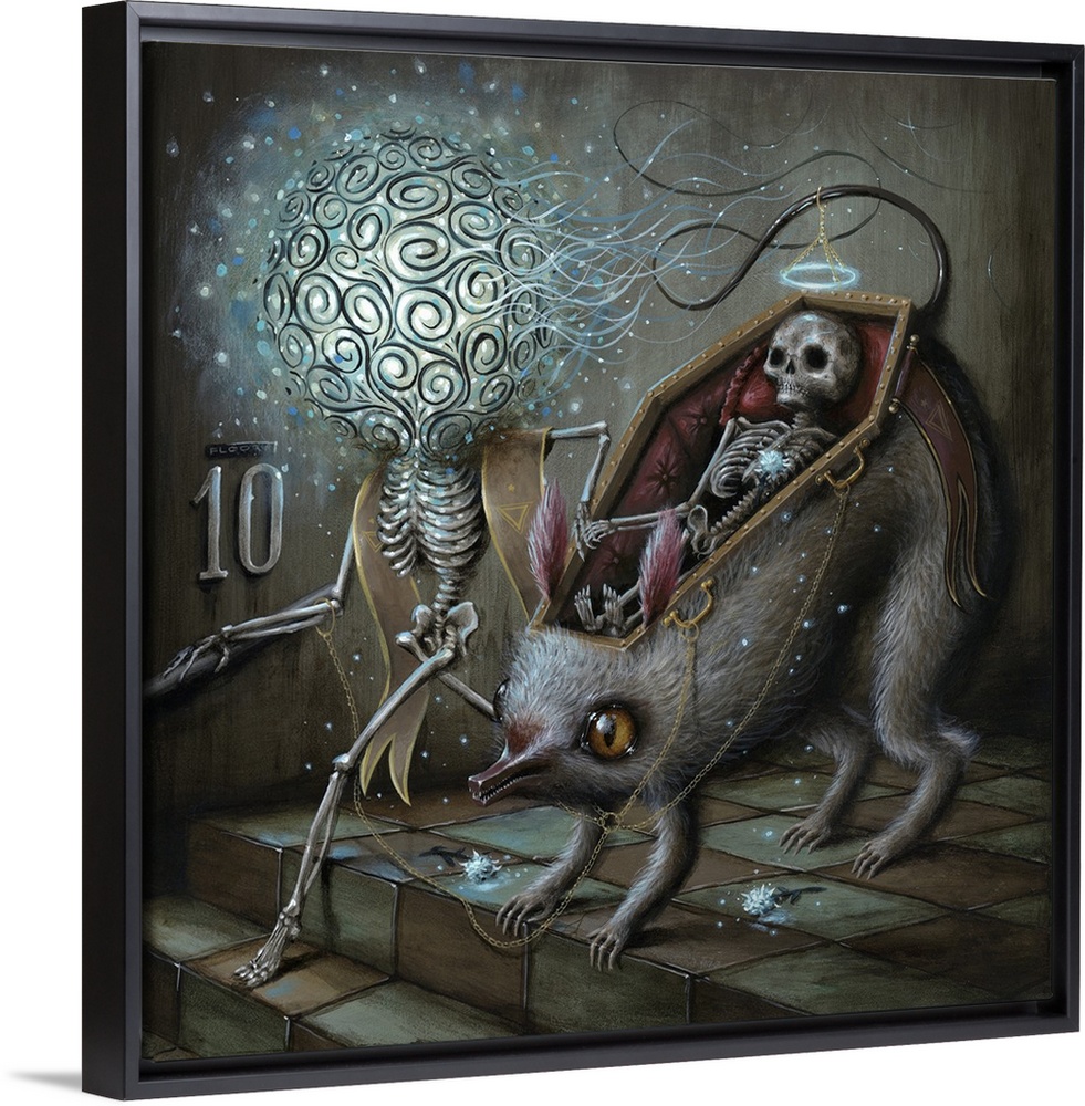<p>Surrealist painting of a human skeleton riding in the coffin shaped back of a rat being led by another skeleton.</p>