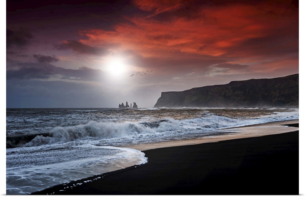 <p>A photograph of a dark coastline under a red clouds.</p>