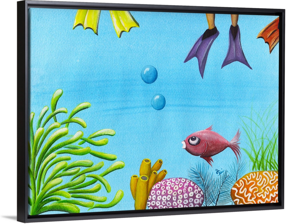 <p>Vibrant painting of a fish swimming through the coral reef with colorful scuba fins on the top of the water.</p>