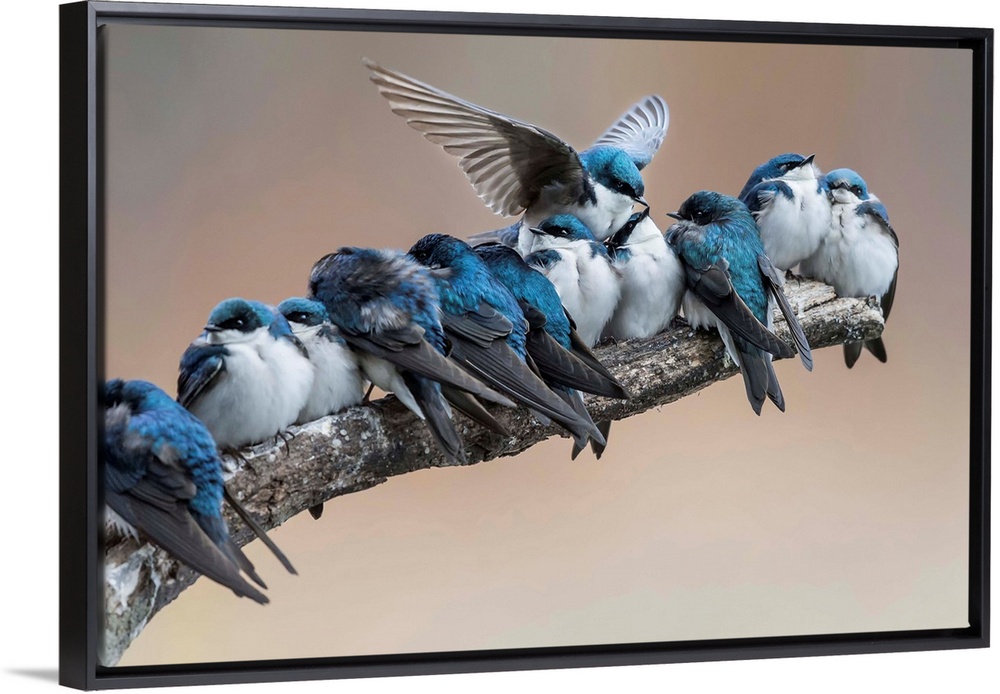 <p>A branch with a bunch of little blue birds on it is disrupted when another bird tries to squeeze himself in between others.</p>