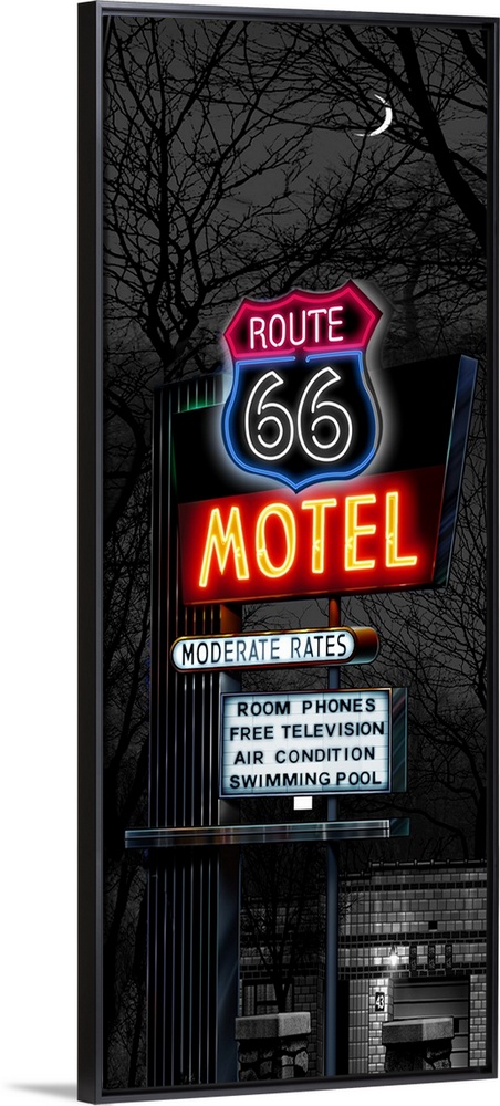 <p>Digital art painting in black and white with some color of the Route 66 Motel sign at night.</p>