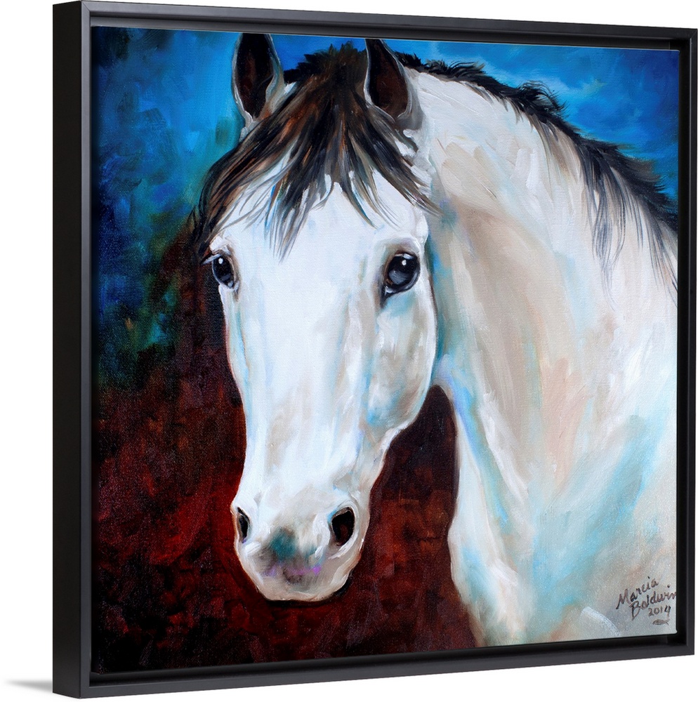 <p>Painting of a white horse with a black mane on a dark red and blue square background.</p>