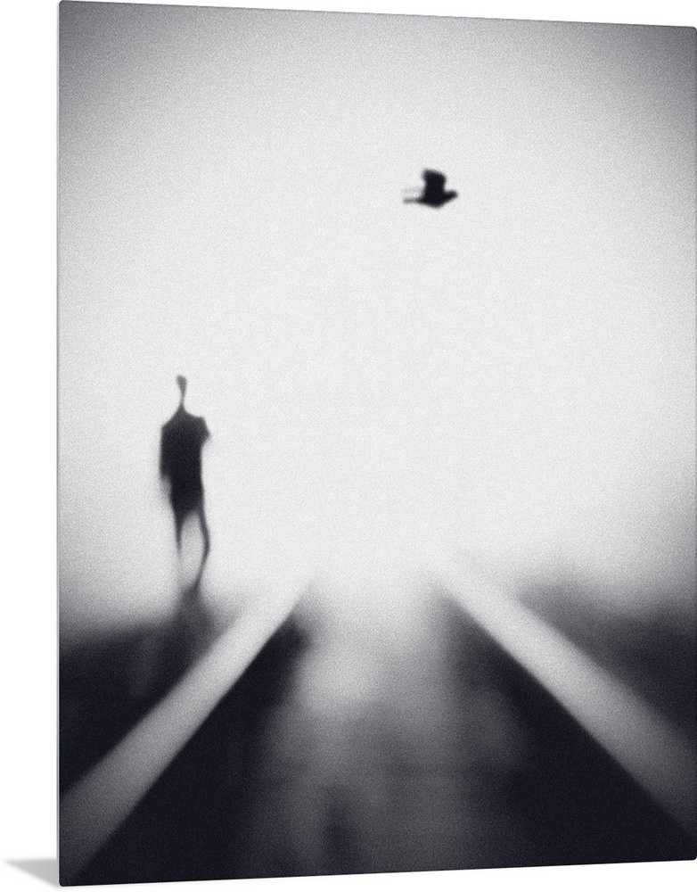<p>Soft focus image of a man walking near rails with a bird overhead.</p>