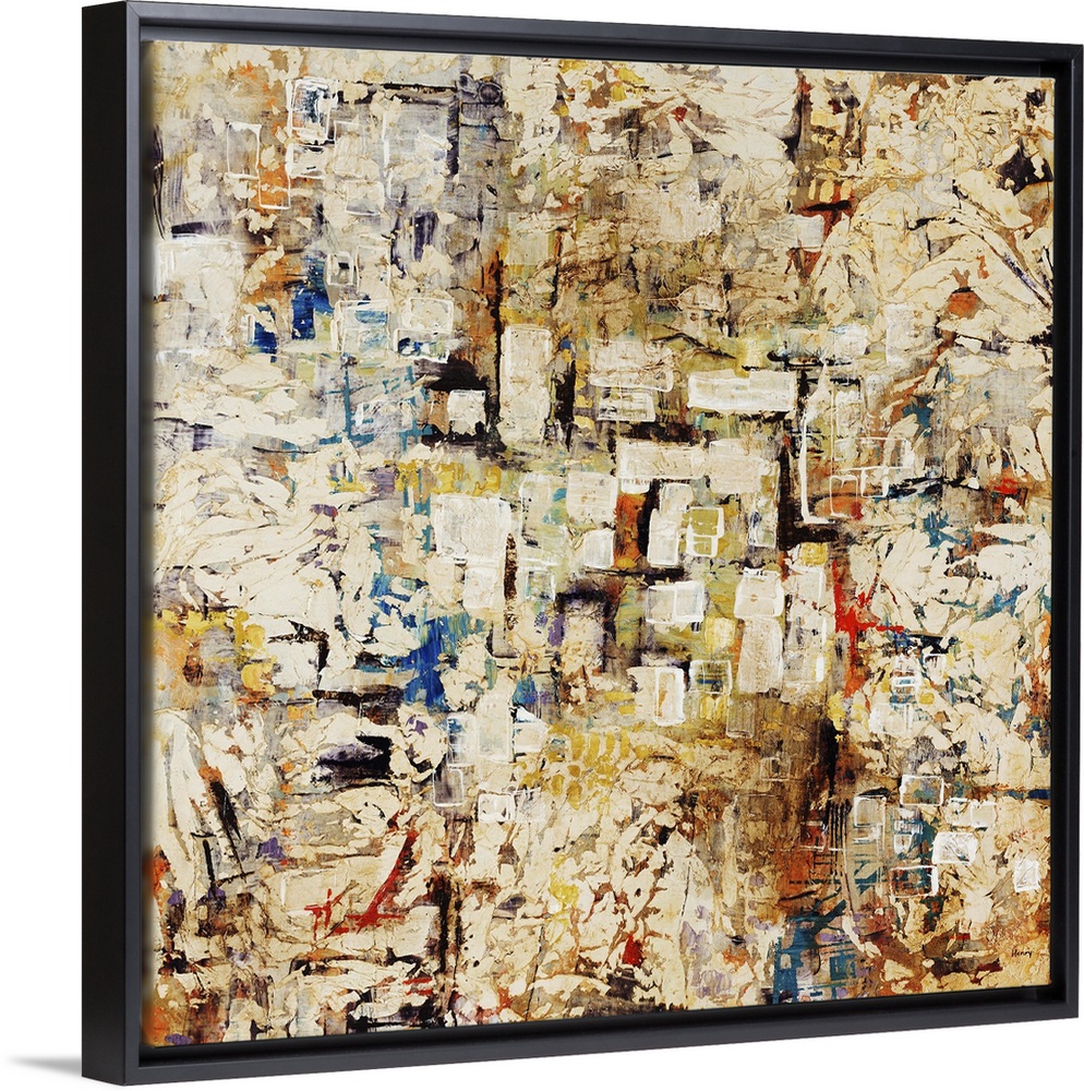 <p>Painting of many small square and abstract shapes in lighter colors, surrounded by contrasting vibrant colors and textures.</p>