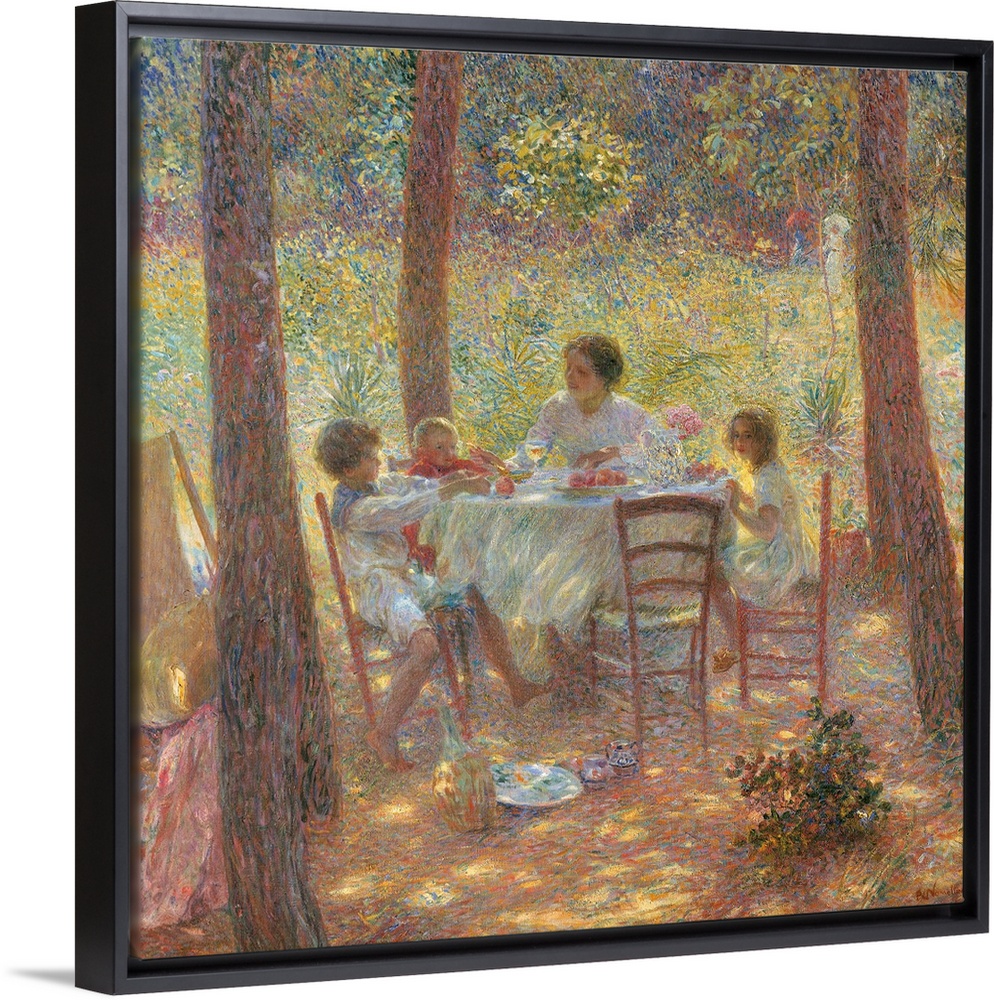 <p>Noon, by Plinio Nomellini, 1912 about, 20th Century, oil on canvas, cm 198 x 198 - Italy, Tuscany, Florence, Palazzo Pitti, Gallery of Modern Art. All. Noon midday pine forest pine wood family mother woman children lunch table chairs trees dish flask. (17</p>