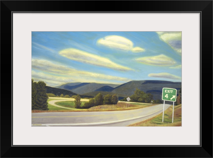 <p>Contemporary painting of a highway with an exit sign in the New England countryside.</p>
