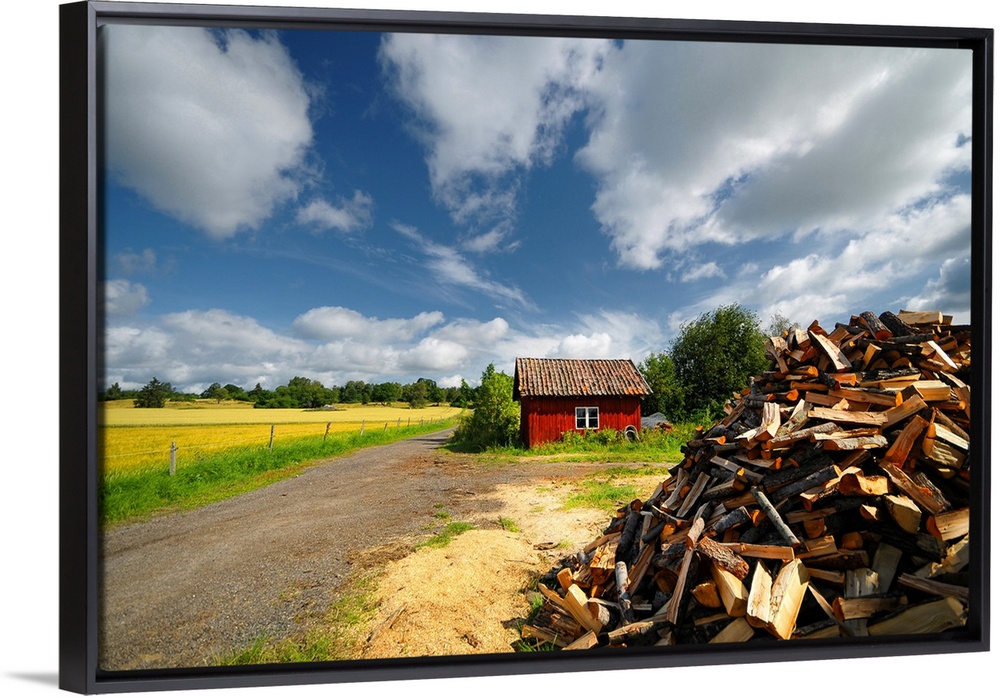 <p>Nordic landscape with a red wooden house</p>