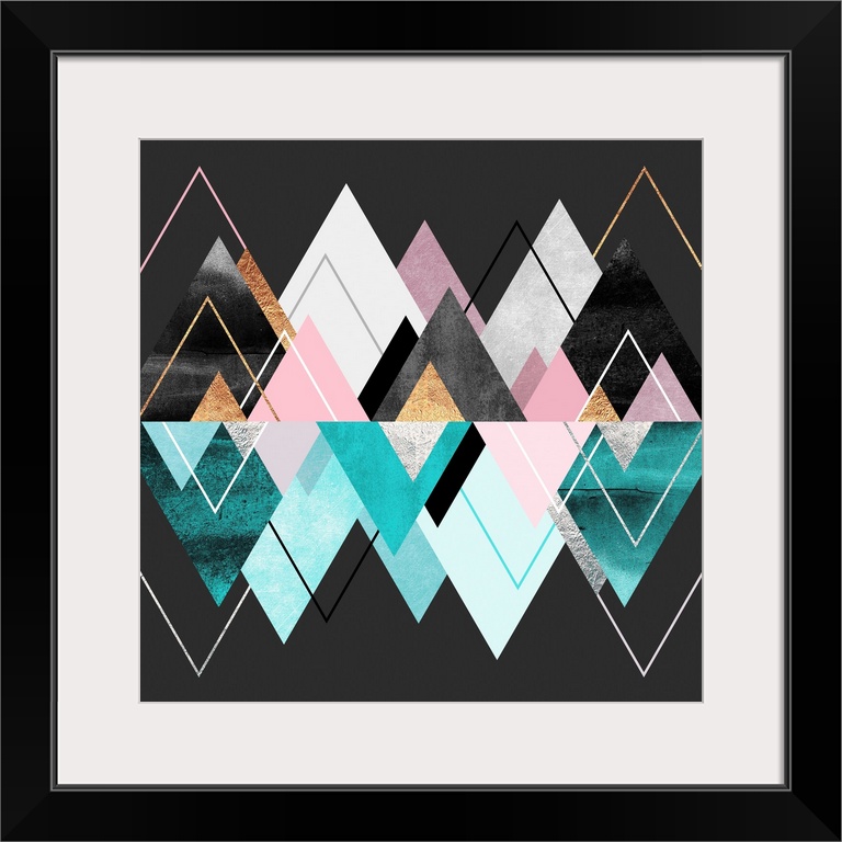 <p>Contemporary, geometric design featuring overlapping triangles in shades of rose gold, copper, grey, ivory and blue representing a series of mountains and their reflection.</p>