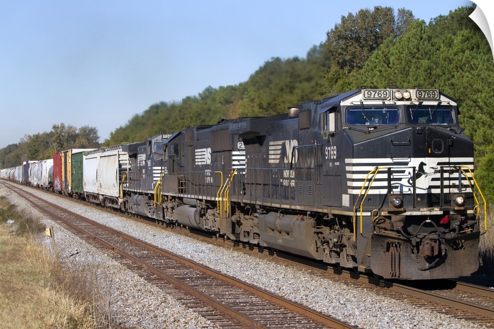 <p>Norfolk Southern Railway locomotive traveling along Highway 72 west of Mussel Shoals, Alabama, USA.</p>