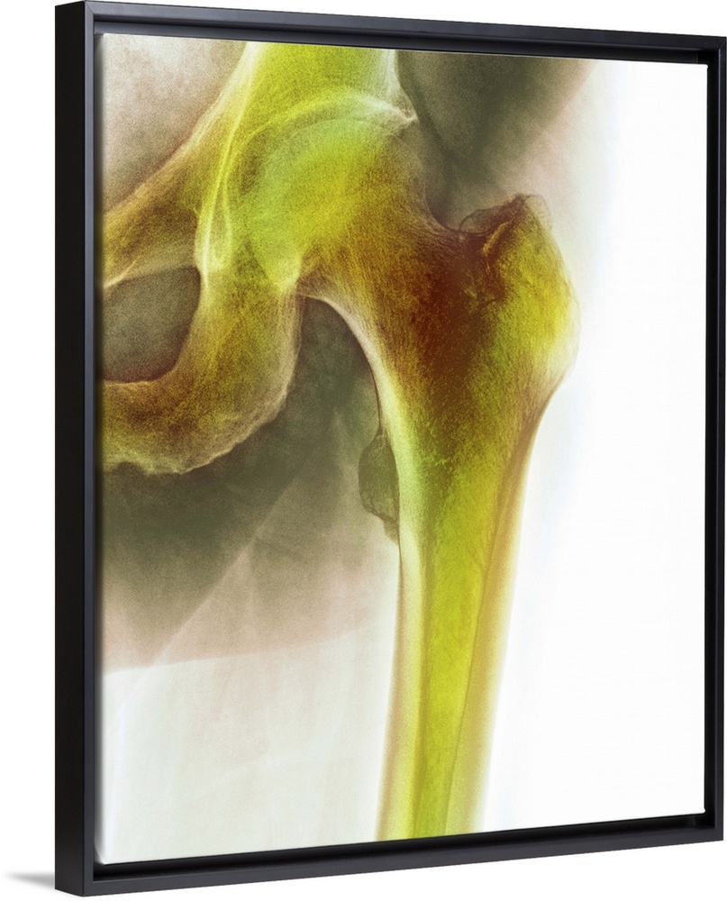 <p>Normal hip. Coloured X-ray of the hip of a 90 year old man.</p>
