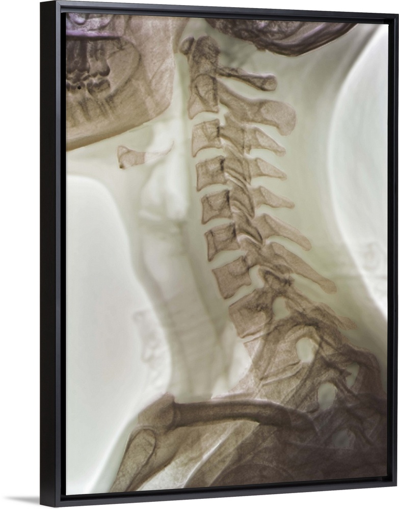 <p>Normal neck. Coloured X-ray of the cervical spine of a 27 year old.</p>