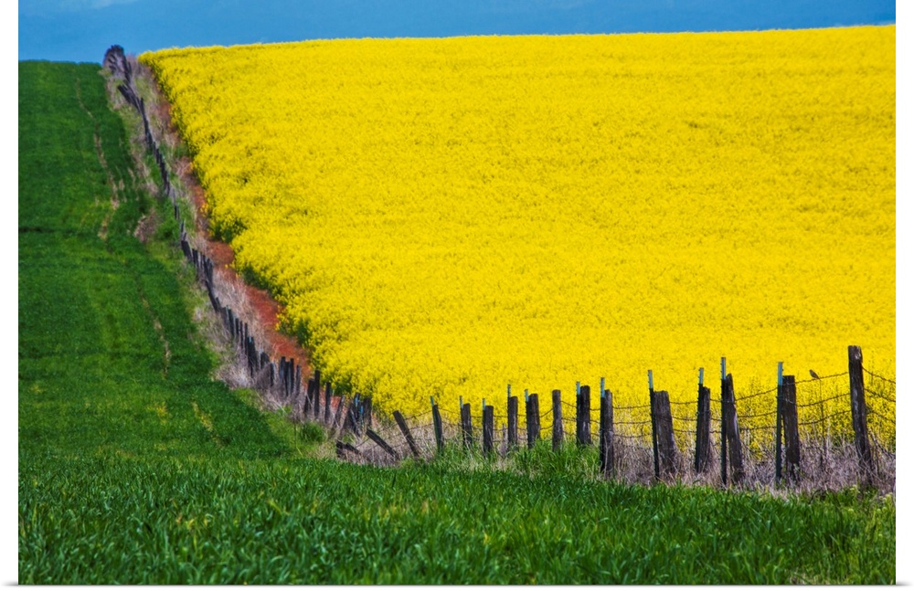 <p>North America, Idaho, Grangeville, Canola Field in Full Fresh Bloom Along Fenceline</p>