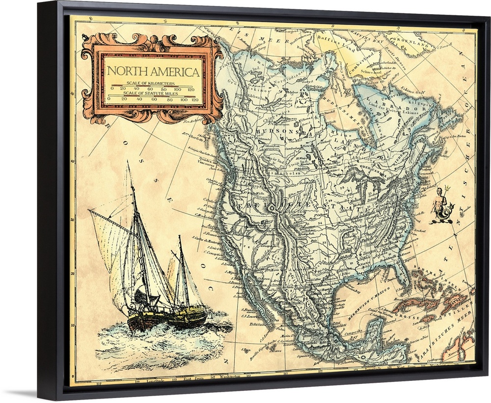 <p>Big landscape artwork of a vintage map of North America with an illustration of a large ship in the lower corner.</p>